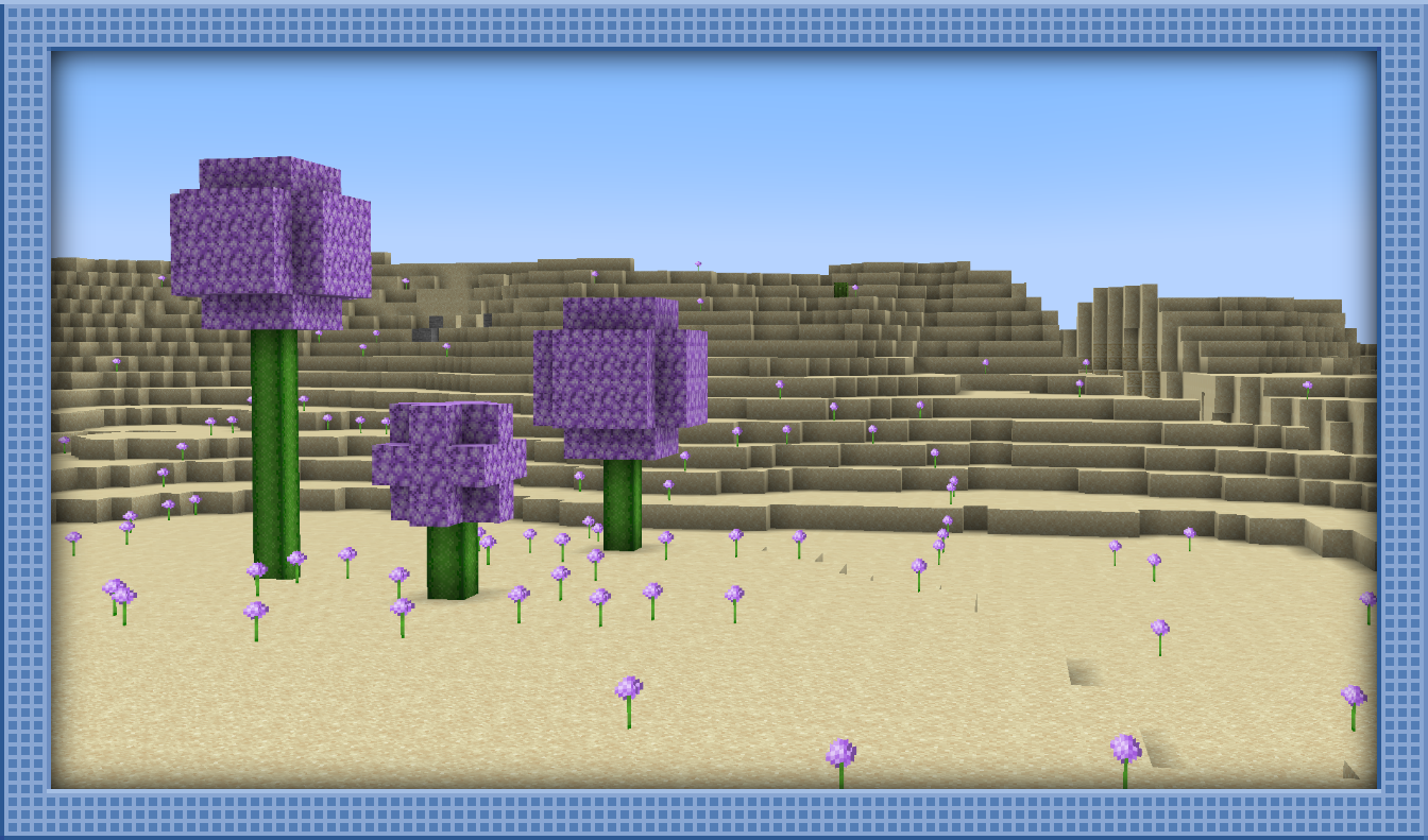 This mod features Giant Alliums, which generate in the new Allium Desert biome. The Allium Desert is a Desert biome with Alliums planted everywhere. Giant Allium Stems can be crafted into the new Allium woodset. Alliums can also now be placed on any block and generate in every biome, even including biomes like the Deep Dark!