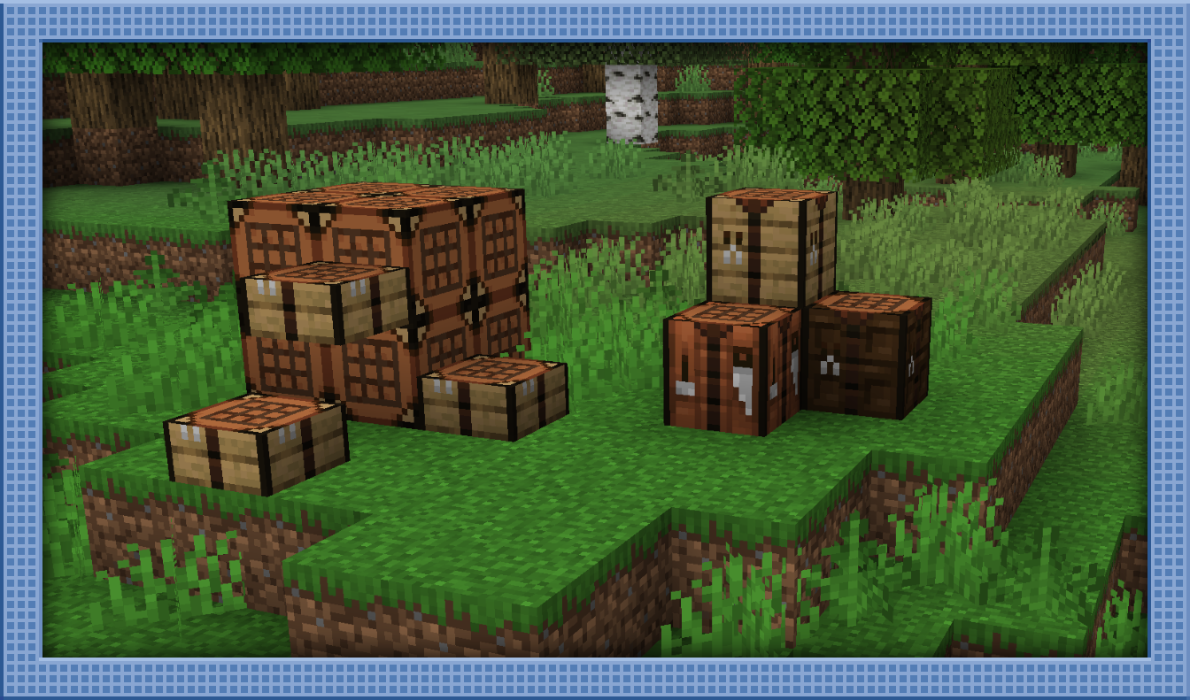 Craftingworks includes the necessary addition of variants of Crafting Tables for every wood type, as well as Crafting Table Slabs, and the brand new 'Crafting Grid' block, which is just the top of a Crafting Table.